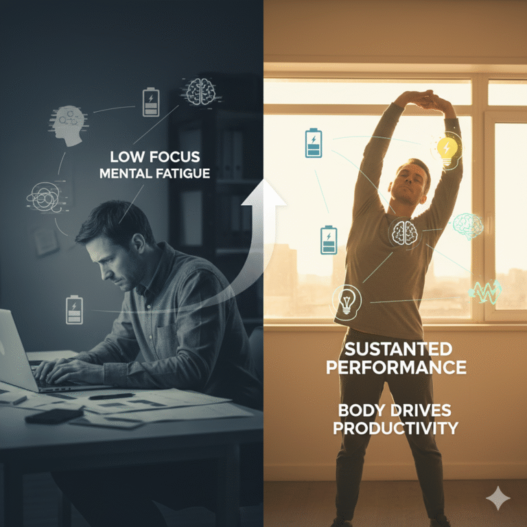Most productivity advice overlooks the body. Long, screen-heavy days quietly drain the systems that sustain focus, memory, and creative thinking. You can’t think clearly when your body is out of rhythm. Posture slips, tension build, and energy fades. Sustainable performance begins with movement. The body doesn’t just support productivity. It drives it.